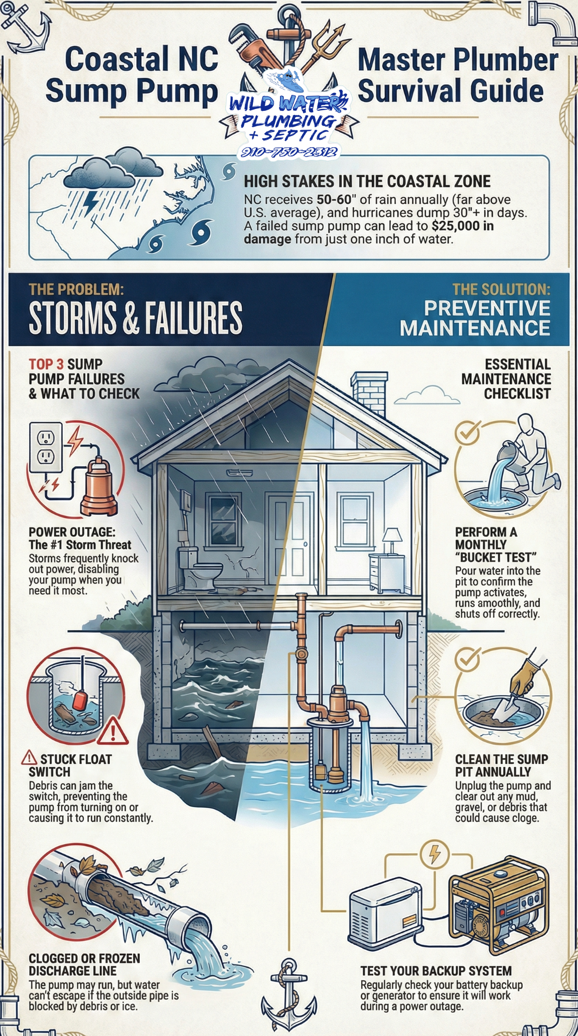 The bottom line: if your sump pump fails during a storm or when groundwater rises, your property is at risk of major damage. Even just 1 inch of water can cause up to $25,000 in damage to a home, ruining drywall, floors, and precious belongings. In this guide, I’ll explain in plain language how to troubleshoot common sump pump problems so you can keep your North Carolina home dry and safe. I’ll cover power outages (a major issue during hurricanes), mechanical failures, drainage issues, seasonal maintenance, and local coastal factors. By the end, you’ll know how to spot and fix sump pump issues before they become disasters, with practical tips drawn from my experience as a plumber in Onslow, Pender, Carteret, and New Hanover counties.
