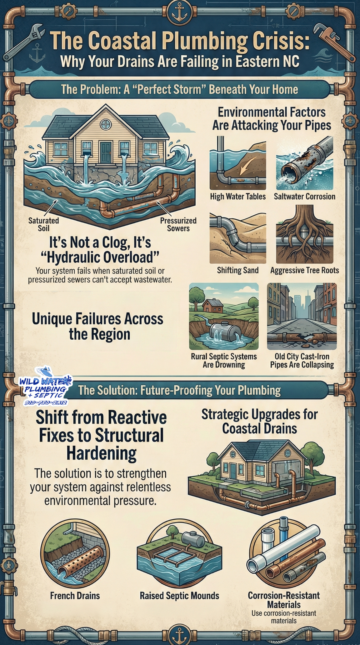 The drainage and plumbing infrastructure in Onslow, Pender, Carteret, and New Hanover counties is currently facing a systemic crisis driven by a “perfect storm” of geological, environmental, and aging structural factors. Unlike inland regions where plumbing failure is often a localized blockage, coastal failures are frequently driven by “hydraulic overload”—a condition where the receiving environment (soil or municipal sewer) is too saturated or pressurized to accept waste. High water tables, aggressive saltwater corrosion, unstable sandy soils, and the intrusion of maritime forest root systems are causing widespread failures in both private septic systems and municipal infrastructure. Specifically, rural areas like Down East Carteret and Hampstead are seeing septic failures due to rising groundwater, while historic urban centers like Wilmington and older military housing in Midway Park are battling the collapse of legacy cast iron and Orangeburg piping. Immediate mitigation requires a shift from reactive maintenance to structural hardening, including the use of French drains, raised septic mounds, and corrosion-resistant materials.