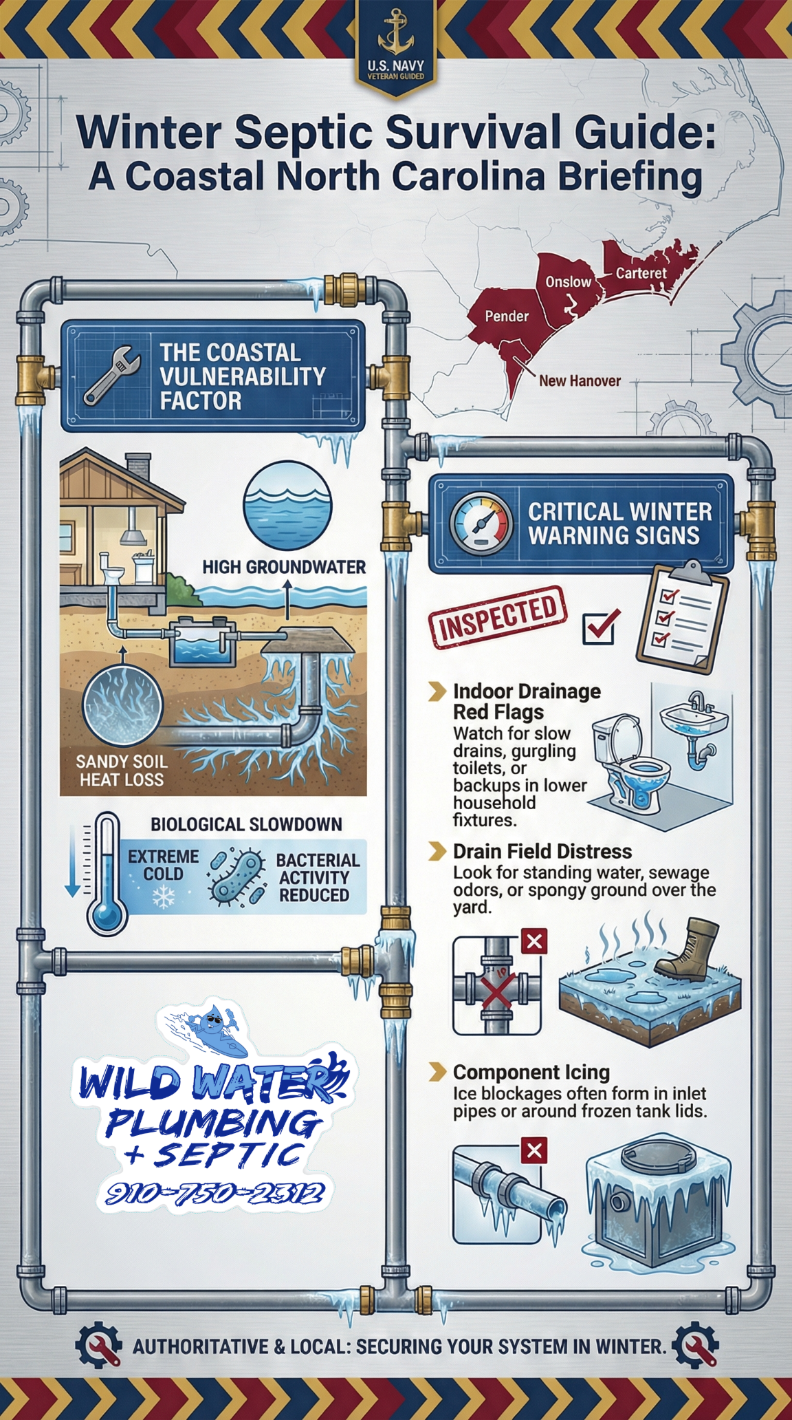 When temperatures drop below freezing in Onslow, Pender, Carteret, and New Hanover Counties, septic systems are at real risk due to shallow installations, sandy soils, and high water tables. The most common winter failures I see are frozen inlet and outlet pipes, iced over drain fields, frozen tank components, and flow blockages caused by low water use. These issues often lead to slow drains, sewage backups, yard saturation, and emergency service calls. The key takeaway is simple: freezing septic problems are predictable, preventable, and far easier to address early than after a full system failure.